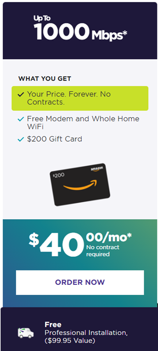 결국 은행계좌로 자동이체를 해놓으면 매달 $43.74(IL 가격) 의 가격으로 기가 인터넷(up to 1000 Mbps) 서비스가 가능하다. 게다가 $200 기프트카드도 준다고 하니 이제까지 찾아본 인터넷 딜중에서는 최고의 딜이라고 생각된다.